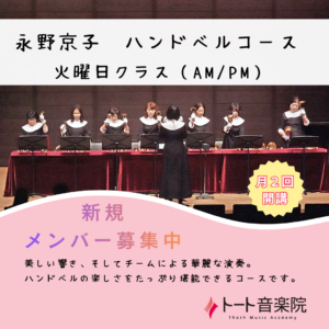 本格的なイングリッシュ・ハンドベルは最大3オクターブの音階を持ち、メロディだけではなくコードや伴奏パートの演奏も可能です。ジャンルにこだわらない表現豊かなハンドベル演奏を、永野京子先生が優しく丁寧に指導いたします。まずは見学や体験レッスンからでもお気軽にご参加ください。